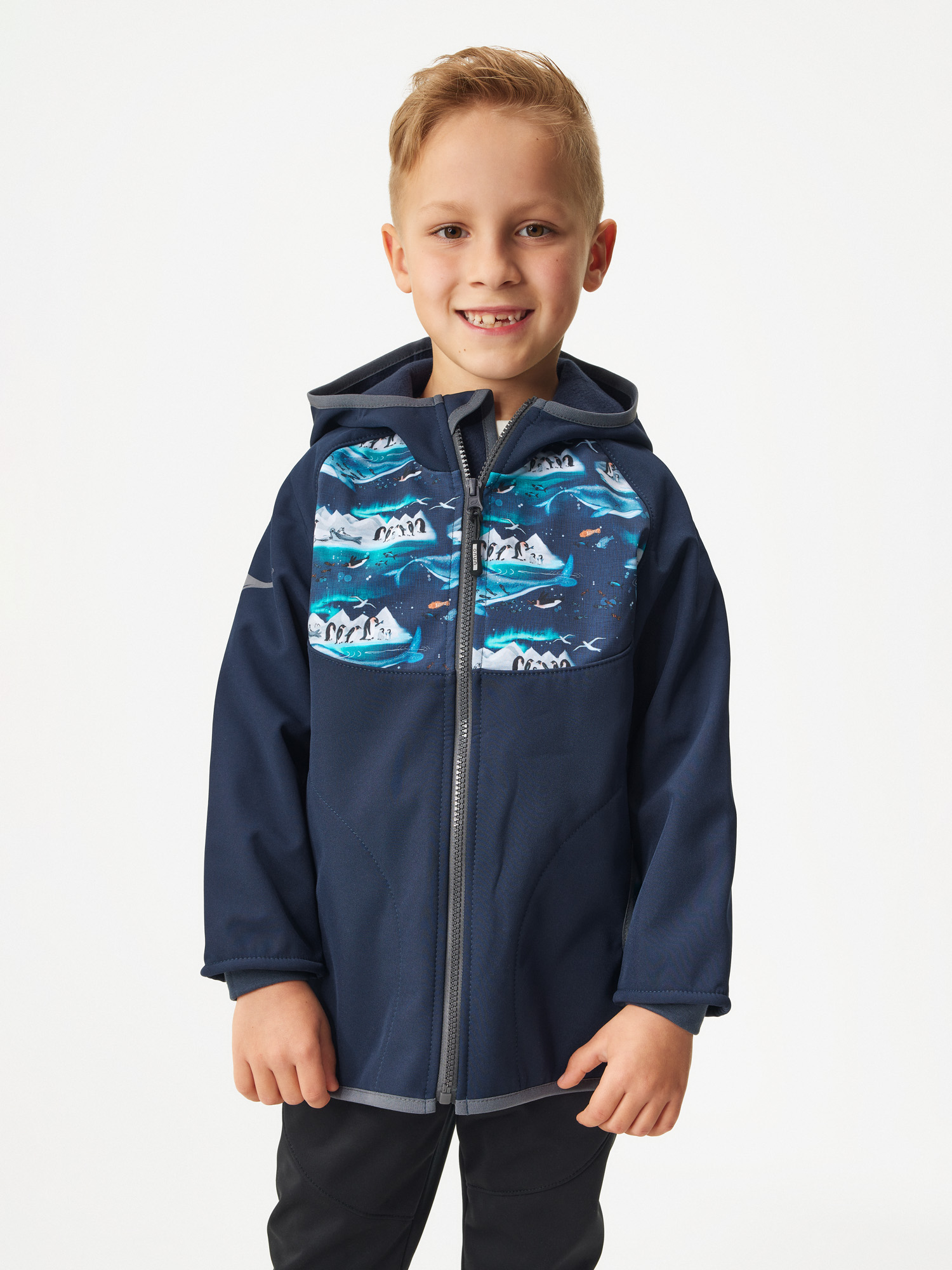 Detská softshellová bunda s fleecom Basic, Tm. Modročierna, Tučniaky Veľkosť: 104/110
